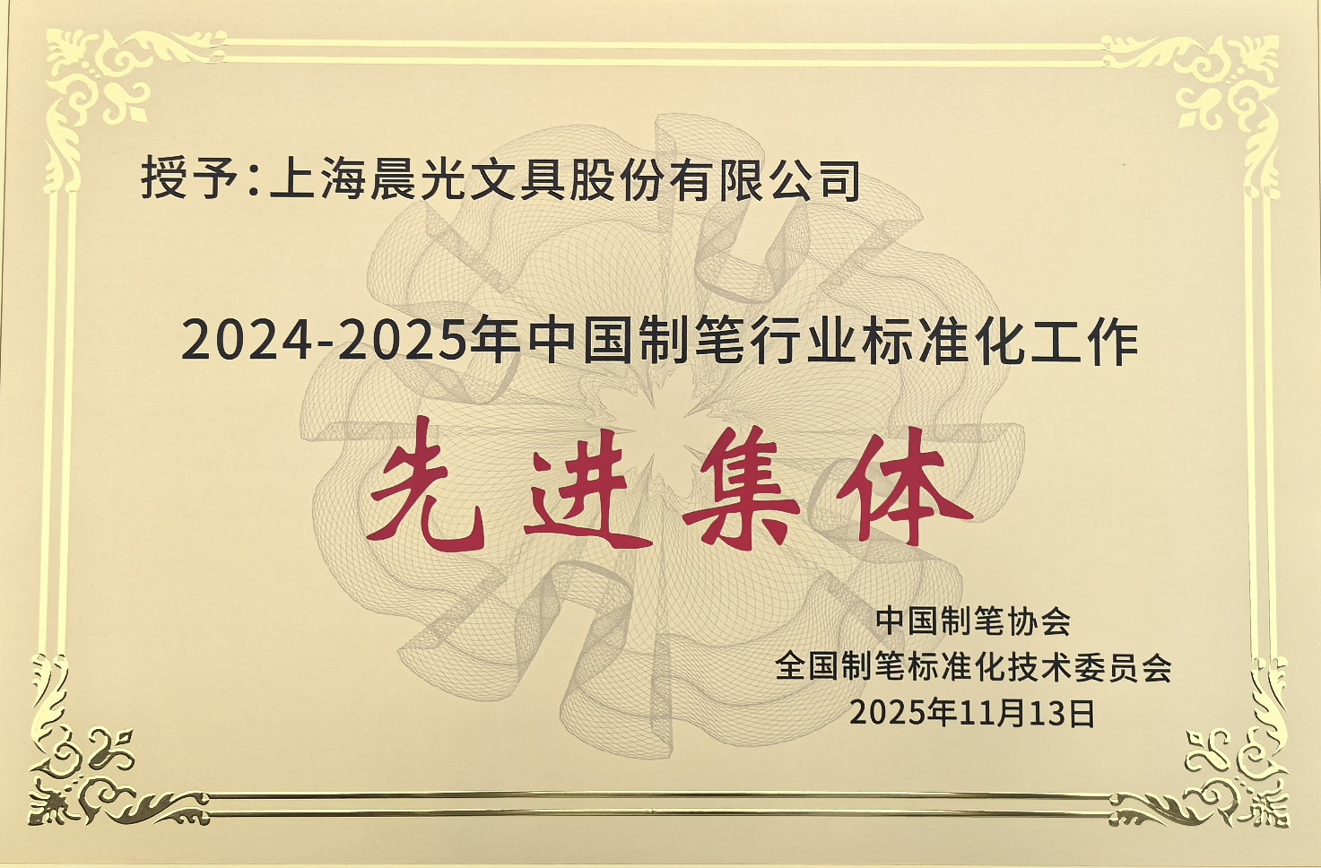 發(fā)布日期:2025-11-18近日,2025年全國制筆標(biāo)準(zhǔn)化技術(shù)委員會年會暨中國制筆行業(yè)標(biāo)準(zhǔn)化工作會議在浙江湖州召開。會上,上海晨光文具股份有限公司憑借在標(biāo)準(zhǔn)化建設(shè)方面的持續(xù)深耕與突出貢獻,被授予 “2024-2025年度中國制筆行業(yè)標(biāo)準(zhǔn)化工作先進集體” 稱號,彰顯了行業(yè)對其標(biāo)準(zhǔn)化工作的權(quán)威認(rèn)可,也體現(xiàn)了晨光作為領(lǐng)軍企業(yè)在推動產(chǎn)業(yè)規(guī)范發(fā)展中的示范作用。